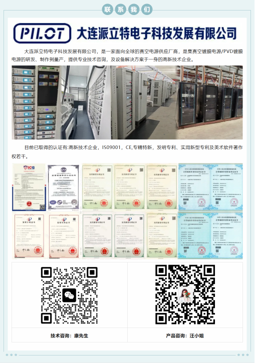 大連派立特電子科技發(fā)展有限公司,是一家面向全球的真空電源供應廠商,是集真空鍍膜電源/PVD鍍膜電源的研發(fā)、制作到量產(chǎn),提供專業(yè)技術咨詢,及設備解決方案于一身的高新技術企業(yè)。 主要在售電源品類如下,已廣泛應用于諸多業(yè)內(nèi)頭部企業(yè)并得到高度認可,支持按需定制: 多弧電源 燈絲電源 清洗電源 轟擊電源 靜電吸附電源 脈沖弧電源 中頻濺射電源 脈沖偏壓電源 離子源電源 直流磁控濺射電源 直流脈沖濺射電源 and so on... 目前已取得的認證有:高新技術企業(yè),ISO9001,CE,專精特新,發(fā)明專利、實用新型專利及美術、軟件著作權若干。